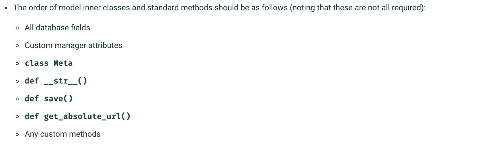 현재 근무 중인 회사에서 사용 중인 Django model의 컨벤션입니다. django 공식문서에 작성되어 있는 컨벤션과는 다른 형태를 가지고 있다는 점이 조금 안타깝긴 하지만 프로젝트 내에 이미 통일된 컨벤션으로 이용되고 있기 때문에 수정하지 않았습니다.