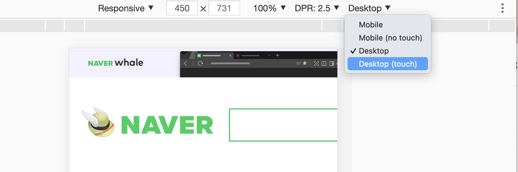 인터넷에서 찾아보면 이거해라 저거 해라 말들이 많은데 삽질하면서 찾은 가장 간단한 방법은 개발자 도구를 켜고 toogle device toolbar 모드를 활성화시킨 다음 브라우저의 디바이스 타입을 mobile로 변경하는 방법이다.