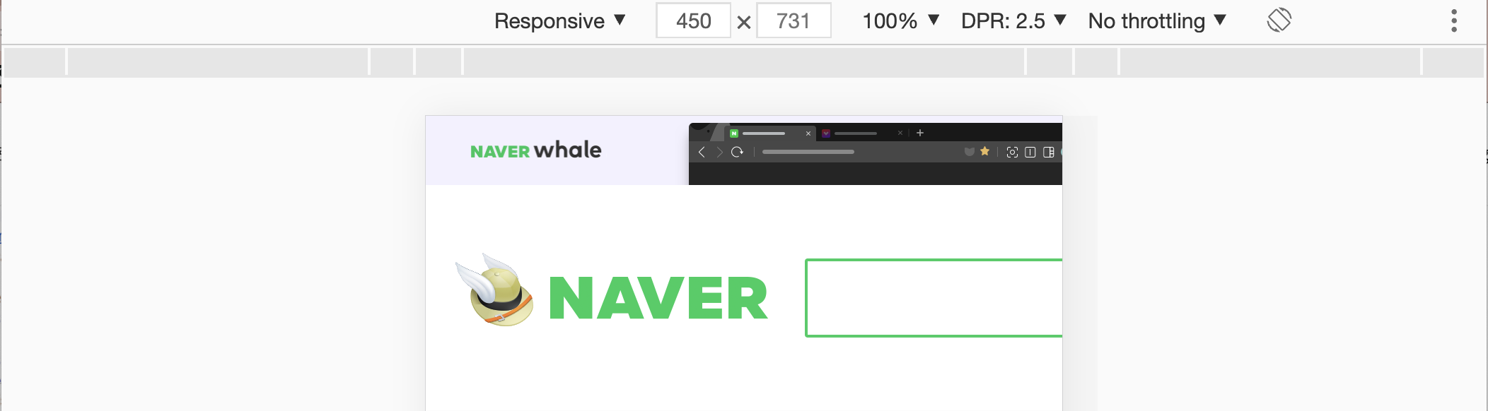 2. 왼쪽 상단에 전체 화면 버튼(초록색 동그라미) 하단에 있는 아이콘을 누른다.(toogle device toolbar를 활성화시킴)