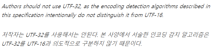 - 한 글자에 고정적으로 4바이트를 할당하기 때문에 다른 인코딩 방식에 비해서 많은 용량을 차지하고 있습니다.